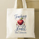 Teachers deserve a big thank you for all they do. With this special tote bag you can say thank you with a memorable keepsake gift. Personalize this Teaching is a Work of Heart design with your special teacher's name! Pretty script typography surround a heart apple and little flowers. See coordinating items and our other teacher gifts in our shop, Enchanted Finch.