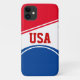 This Apple iPhone 11 case is shown in a red ,white and blue design with USA text.