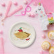 A paper plate with a smiling, apple pie, character. The words can be customized.