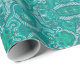 Wrapping paper featuring elegant pattern in teal and mint green, stylized leaves and whimsical striped curves, bohemian / ethnic / hippie / vintage style, hand drawn pastel texture.