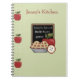 Use this cute and creative apple theme notebook to keep track of all your favorite, recipes, list or just a place to jot down notes. This apple themed notebook features a sage green background with a green plad spine wrapping just over the front edge and over the back of the book. The front shows a cute apple theme including apples, apple pie and a chalk board. Customize your notebook with your own text using the text wording template.