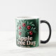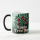 This Morphing Mug features a stylized illustration of an apple tree with five bright red, metallic apples hanging from its branches on a green gradient background. The tree has a single thick trunk and multiple branches spreading outward, decorated with green leaves. The apples are glossy, and have a three-dimensional appearance with highlights and shadows. The text Apple Tree Day is in large pink text in the lower center, with January 6th below it in a smaller size. The composition has a vintage or retro aesthetic, with the green background fading from lighter to darker shades. The illustration has a modern graphic design style with details in the leaves and apples. The apple tree image is on both sides of the mug. When you put a hot drink in the mug the image becomes visible.