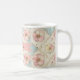 A floral applique patchwork pattern with pink and ivory flowers roughly stitched onto blue and ivory fabric, with worn, ecru lace gives this mug a shabby and chic look that you will love. Resembles and old quilt, forgotten in an attic. Very feminine, perfect for anyone who loves stitching.