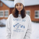 Fun apres ski bachelorette sweatshirt featuring a drawing of winter mountains, trees, a skier, and a text template that is easy to personalize.