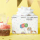 Cute birthday theme design featuring Destei's original cartoon illustration of a cute apricot parti-color coat color miniature Goldendoodle breed dog. Next to the dog there are colorful birthday balloons tied on a dog bone and a purple and yellow color present box. The background has a playful pattern of colorful pastel confetti on a white background. There is also a personalizable text area.