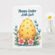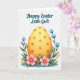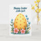 Designed with a spring celebration in mind, this digital illustration centers on a large glowing egg shape shaded from golden yellow to soft apricot, dotted with neat tangerine circles. It sits on a rounded teal base, like a gentle pedestal, giving the scene a calm, friendly focus. Around it, leafy green branches curl inward as if they’re leaning close in a quiet, affectionate circle. Blush-pink five-petal flowers with bright yellow centers cluster near the bottom, adding a sweet, companionable touch 🌷. Taller stems rise at the sides with bell-shaped blooms in pale blue, creating a soft frame that feels like two sides meeting in the middle. The background stays white with faint blue-grey polka dots, and a seasonal greeting appears above the artwork in deep teal lettering, centered near the top. Fine golden-ochre sprigs peek through the greenery, and the egg’s warm gradient stands out against the cool teal base 🐰.