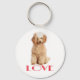Aww...who can resist the sweet face of a poodle pup? This fun keychain features a beautiful curly hair apricot poodle puppy highlighted against a crisp white background with love printed in a bold red font.
