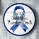 At the center of the button, a bold royal blue awareness ribbon stands as a symbol of prevention, advocacy, and hope for a safer future for children.