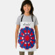 Rings in two sets of White, Blue, and red grow concentrically smaller in thickness as the approach the center. Overlaying the rings are triangles in blue with red outlines that mark alternate segments. Personalize with your name at the top.