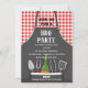 This design features a red gingham background with an apron filled with all the BBQ party essentials. Easy to personalize with your party info. Perfect for any occasion.