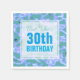 Beautiful abstract background (pastel colors: blue, light purple and turquoise) with a half-transparent white square tag (tiny transparent border) for name, date and birthday. All is customizable for these 30th birthday paper napkins.