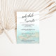This aqua and gold wedding weekend schedule of events enclosure card is perfect for a tropical destination wedding. The simple and modern design features stunning turquoise, teal and light blue watercolor with a soft gold sparkle reminiscent of the sand and sea. It's paired with gorgeous elegant calligraphy.