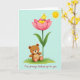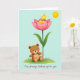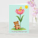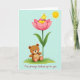 This greeting card shows a tall pink flower rising from a small patch of soft green grass against a pale aqua background. Near the bottom left, a round-eared brown plush-like creature with rosy cheeks sits calmly, tilting its head up as if watching someone it cares about ❤️. At the top of the blossom, a tiny yellow chick perches on the petals, leaning forward in a friendly, trusting way that feels like a quiet bond between them. A simple yellow sun sits in the upper right, adding a gentle warmth to the scene. The colors stay light and sweet—pink petals, a yellow flower center, sunny yellow bird, and fresh green ground—so the characters stand out clearly. Along the bottom, a short line of red cursive text reads, “I’ve always looked up to you,” centered beneath the scene. The flower’s center is a bright yellow circle, and the sun is drawn as a small round shape with short rays 🌼.