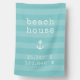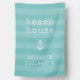 Show your love for your beachside abode with our custom coordinates house flag. Shown with "beach house" and the coordinates beneath, design features your beach house latitude and longitude in white vintage typewriter lettering on a turquoise aqua striped background accented with a nautical anchor illustration. Search for your coordinates on any mapping site and enter them in the template field provided. Makes a unique custom housewarming gift for new homeowners and a perfect addition to your seaside home.