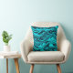A cushion with a vibrant blue and black pattern in shades of bright turquoise shading to black in curved wavy stripes, like rippling waves, with darker shading for a silk or satin look. Please note: this is not satin fabric but a printed design.