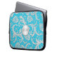 This bright aqua blue and silver floral damask laptop sleeve has FAUX silver medallion with a text box for you to add your own name, monogram, or other text. If you need any help customizing, please email niteowlstudio@gmail.com.