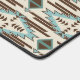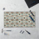 This attractive desk mat features a tribal Aztec style pattern in tones of aqua blue, brown, and tan. The western pattern is placed on a light creamy tan background.