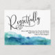 This piece will help alert your tribe that your beach wedding will be rescheduled to another time. This suite of wedding and event designs features a bold, abstract watercolor accent. The paint colors I used are a range of blue, green, turquoise, aqua and teal hues. Key phrases are rendered as elegant \\typography graphic accents using a gorgeous script font. In this piece, this "fancy" font says "Regretfully" and accent words on the back are also coordinated. Use the template fields to easily add your own details and feel free to reword any of my placeholder type to suit your own specifications.