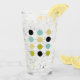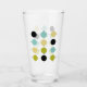This colorful mid century modern glass tumbler features aqua blue, avocado green, black, and yellow circles on a black lined grid. Add that bit of fun to your kitchen cupboard or retro bar cart!