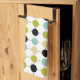 This colorful mid century modern kitchen towel features aqua blue, avocado green, pale yellow, and black circles on a black lined grid. Add that bit of fun to your kitchen decor!