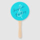 Aqua blue round wedding fans with text on both sides. Names of the couple on one side, with short saying on the other. Text is dark blue and the design is simple. Use at any outdoor wedding for cooling guests, or keeping the bugs away.