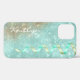 This glamorous phone case has a background of glittery star shine with an aqua blue textured look. Like tiny jewels fitted together, it sparkles! At one side is a bit of rusty gold overlay to add interest, and the other side has an image of an aqua and gold curled ribbon cascading down. Your name is in white script. Unique, and pretty, too!