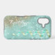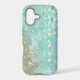 This glamorous phone case has a background of glittery star shine with an aqua blue textured look. Like tiny jewels fitted together, it sparkles! At one side is a bit of rusty gold overlay to add interest, and the other side has an image of an aqua and gold curled ribbon cascading down. Your name is in white script. Unique, and pretty, too!