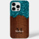 Aqua blue sparkles rustic brown wood Monogram iPhone 15 Case. Personalize with your custom initial and name. Aqua blue sparkles glitter rustic brown wood. Elegant faux sparkly aqua blue sparkles with broken rustic brown piece of wood over it. *photo of sparkles glitter!