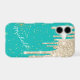 This glamorous phone case has a background deep aqua blue with tiny silver and gold star bursts. The top is covered with silver faux glitter drips. Your name is in white script diagonally across the bottom. Pretty!