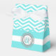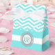 Aqua blue, white chevron zigzag pattern monogram wedding favor box featuring a chevron or zigzag pattern. Along the bottom part there is a turquoise band and your initials in a grey round frame with dots on a white stripe. This monogrammed trendy and cute girly favor box is perfect for other special occasions too such as bridal showers, birthday parties, baby showers etc.
