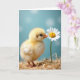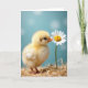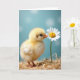This card features a fluffy pale-yellow hatchling standing on a nest-like bed of warm straw, set against a soft aqua background with gentle out-of-focus light circles. The tiny bird leans forward with an affectionate, curious tilt, as if sharing a quiet secret with a single white daisy 🌼. Near the top, a short greeting appears in small, rounded lettering in white, spaced loosely so it feels airy against the blue. A second line of text sits near the bottom in a light yellow tone, echoing the chick’s down and guiding your eye back to the scene. The hatchling’s black eye and small orange beak are sharply detailed, and the beak brushes the daisy’s golden center like a tender hello ❤️. Soft lighting brings out the fine strands of straw and the silky texture of the petals without harsh shadows. Crisp white petals circle a bright yellow center, with the bloom angled slightly toward the chick on the right side of the design.