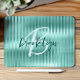 This elegant personalized mouse pad features a monogram and first name in modern script on a background of vertical aqua blue brushed metal stripes.