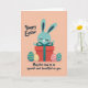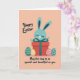 This design shows a cheerful bunny 🐰 with long upright ears and a soft aqua body popping up from a bright red gift box, arms lifted as if reaching out for a hug. A teal ribbon wraps the box and finishes in a neat bow, echoing the bunny’s color and adding a sweet, tied-together look. The bunny’s rosy cheeks and closed, smiling eyes give it an affectionate, friendly expression, like it’s greeting someone special. Around the base sit four decorated eggs in pastel teal, pale yellow, pink, and deeper teal, each with stripes, waves, or polka dots that feel like little love notes in pattern form. The background is a muted coral tone that warms the scene and makes the cool aqua and teal stand out, with a soft spring touch 🌷. Near the top, a seasonal greeting appears in flowing lettering, while a second line of text sits below the box in a smaller style, both set in a light color for easy contrast. Teal accents repeat across the bow and egg details, and the red box stays centered with crisp edges against the coral backdrop.