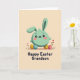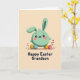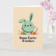 This card features a round, long-eared bunny-like creature in soft aqua, with rosy cheeks and wide dark eyes that seem to linger on the viewer with a tender, friendly gaze 🐰. It sits high in the layout against a muted beige background, giving the character plenty of calm space to stand out. Beneath it is a small grassy mound, where thin stems rise into tiny heart-shaped blossoms that hint at closeness and affection 🌷. Near its feet, several decorated egg shapes are arranged like a shared little treasure pile, each with different patterns in gold, blue, and bright pink. The lighting stays gentle and even, keeping the illustration flat and smooth with crisp edges. Along the lower portion, a short message appears centered in a dark color, set in thick, easy-to-read lettering. The egg designs include stripes, dots, and wavy geometric accents, and the heart blossoms sit on slender green stems above the grass.