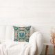 A two-toned aqua butterfly rests on an ornate tan medallion on this beautiful throw pillow.