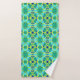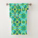 Towel set in a tie dye pattern in shades of cobalt blue, green and yellow with an aqua / seaglass green background
