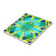 Ceramic tile in a tie dye pattern in shades of cobalt blue, green and yellow with an aqua / seaglass green background