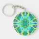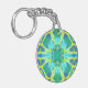 Keychain in a tie dye pattern in shades of cobalt blue, green and yellow with an aqua / seaglass green background