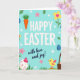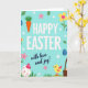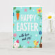 Designed with a light aqua background like a clear spring sky, this Easter card centers on large white sans-serif text reading “HAPPY EASTER.” Just beneath it, a smaller flowing line in white says “with love and joy!” and sits slightly angled for a gentle, affectionate tone. Around the lettering, simple garden shapes scatter across the page, including yellow and pink flowers, tiny white star-like blooms, and curved green leaves, with a bright orange carrot and green top near the upper area 🌷. Near the bottom, a white egg-shaped character dotted in pink and yellow wears a snug fuchsia knit-style cap, leaning into the scene like it’s posing for a friendly snapshot 🐰. Close by, a small yellow chick with pink wings and orange feet stands in the grass, turned as if watching over its cozy companion. On the right edge, a partly shown woven basket peeks in, suggesting more treats just out of view. The lower border is filled with stylized green blades of grass, with the basket tucked behind them and the chick standing just left of it.