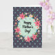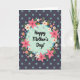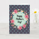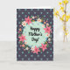 This greeting card features a centered circular design with a bright aqua medallion that has a faint plaid texture, setting a gentle, caring tone ❤️. Inside the circle, the words “Happy Mother’s Day!” sit in the middle in black, flowing lettering that feels like a warm note meant just for her. A ring of flowers wraps around the message like an affectionate hug, with large pink blooms opening wide beside soft white, daisy-like flowers. The white flowers have orange-yellow centers that add a sunny spark, and small blue and yellow blossoms tuck in close, as if leaning toward one another in friendly company 🌼. Fresh green leaves weave through the wreath, and a dashed white line traces the inner edge to give the border extra detail. Behind everything, a deep indigo background sets off the brighter colors while keeping the scene calm and cozy. Scattered across that dark backdrop are tiny turquoise flower shapes arranged in a repeating pattern.