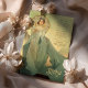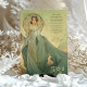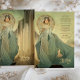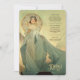 This refined Art Nouveau wedding menu card embodies elegance and artistic detail. The front design showcases a stunning figure in a flowing aqua gown with intricate floral embroidery, framed by soft gold accents and a luminous halo of stylized roses. The ethereal backdrop features grand golden arches and muted gradients of sage green, cream, and pale mint. The back complements the artwork with a tastefully arranged menu in a classic serif font, mirroring the soft sophistication of the overall design. Ideal for vintage-themed, elegant, or pastel weddings, this card seamlessly blends luxury and artistic charm.