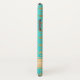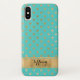 This stylish aqua blue and gold Case-Mate Barely There iPhone X Case has a pattern of small gold crowns on it that are sure to be a standout! The case has a wied gold band across the bottom that is personalized with a name or other text.