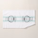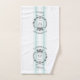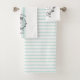 Dress your bathroom in chic, French country flair with this personalized towel set featuring a vintage "home of" crest monogram and your surname flanked on the sides by aqua ticking tape style stripes.
