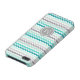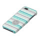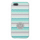 Chic and modern iPhone 5c custom monogram case in elegant turquoise teal blue, gray, and white retro chevron zigzags stripes pattern.