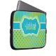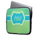 This personalized aqua blue, lime green, and white polka dots and stripes laptop sleeve has text boxes for you to customize with your own name, initials, business name, or other text. If you need any help customizing, please email niteowlstudio@gmail.com.