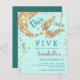Make your little girl's 5th birthday party a magical experience with our customizable mermaid theme paper invitation. This charming affordable invitation features a magical mermaid tail in gold and aqua tones with cute seahorses that will transport her guests into an underwater fantasy world. The glitter print adds an extra bit of sparkle and glamour to the design. Customize it with your party details and get ready to make a splash with this delightful invitation.