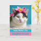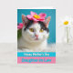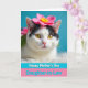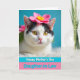 This card features a close-up of a calm white cat with deep black patches on its ears and around its golden-yellow eyes, looking straight ahead with a gentle, companionable gaze ❤️. A many-petaled fuchsia flower with a bright yellow center rests on its head, with a hint of green leaves tucked beside it, like a sweet little gift. The cat sits on a fluffy, cloud-like white surface that makes the scene feel cozy and inviting. Behind it, a smooth turquoise background adds a fresh contrast that keeps the cat’s face and flower front and center. Soft, diffused light shows fine fur textures and gives the portrait a tender, affectionate mood, like a quiet moment shared between close friends 🌼. Near the bottom, a two-part message is arranged in stacked bands, with the first line in crisp white lettering on an aqua banner. Beneath that, a second line appears in teal text on a rose-pink strip, with the color breaks forming clear horizontal sections across the lower edge.