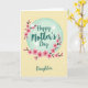 This card features a soft circular wash of muted teal in the center, with a gentle watercolor look that feels calm and caring. Across the teal circle, the words “Happy Mother’s Day” appear in flowing lettering, set in a darker teal that stands out without feeling harsh. Curving around the top half of the circle is an arch of pink flowering branches, where each bloom has simple petals and a deeper red center, like little kisses tucked into springtime 🌼. Three small white birds rest and flutter near the branches, their quiet movement suggesting a tender closeness, like a shared glance between loved ones ❤️. The background is a creamy yellow that reads like warm morning light, adding an easy, friendly glow behind the main design. Near the bottom, the word “Daughter” sits below the circle in matching flowing lettering, placed neatly as a sign-off. Small white dots are scattered across the yellow backdrop, like soft confetti floating around the teal centerpiece.