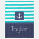 Nautical fleece blanket with turquoise & navy blue striped pattern and customizable text.
