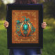 Beautiful wall art print features an AI-generated aqua and orange Steampunk style pumpkin illustration on vintage book cover background. Perfect for Halloween and Fall.
